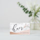 Modern and elegant business cards for hairstylists with faux rose gold scissors, blush pink & rose gold colour block, white marble texture and elegant calligraphy font.