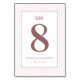 This elegant wedding table card features a minimalist design with a large, stylised number "8" as its focal point. The colour palette includes soft pink stripes and muted maroon accents, creating a sophisticated and romantic atmosphere. The layout is clean and balanced, with delicate cursive typography for the word "table" and simple serif fonts for additional text, ensuring clarity and refinement. Perfect for formal occasions, this card combines modern aesthetics with understated elegance, making it an ideal choice for couples seeking a timeless look for their special day.