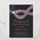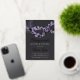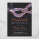 Elegant masquerade ball invitations for your quinceanera celebration feature an ornate mask in orchid purple and rose gold foil on a rich charcoal black background, adorned with a feather. Personalise with your party details beneath in calligraphy script and block lettering.