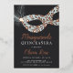 Elegant masquerade ball invitations for your quinceanera celebration feature an ornate mask in light aqua and rose gold foil on a rich charcoal black background, adorned with a feather. Personalise with your party details beneath in calligraphy script and block lettering.