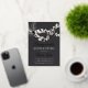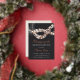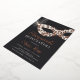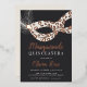 Elegant masquerade ball invitations for your quinceanera celebration feature an ornate mask in off white and rose gold foil on a rich charcoal black background, adorned with a feather. Personalise with your party details beneath in calligraphy script and block lettering.