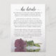 This beautiful wedding enclosure card is designed to give you extra space for whatever information your guests may need, including website, registry, reception, travel, accommodations, or any other details. The card features a gorgeous design with a single reflecting mauve pink coloured rose and a lacy script calligraphy title reading "the details." The back is a marbled dusty rose colour.