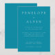 Impress your guests with this minimalist wedding invitation by JessicaAmber. This classic card features simple serif typography, with the couple's first names featured prominently at the top. The background is a vibrant mediterranean blue. This invitation is preferred for when the couple are hosting the event themselves.