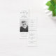 Create a meaningful keepsake with our Memorial Prayer Funeral Sympathy Photo Bookmark Cards. These cards are designed to honour the memory of your loved one and offer comfort during this difficult time. Each bookmark features a personalised photo, allowing you to showcase a special moment that captures their spirit. The design is modern and elegant, with a space for a heartfelt prayer or message on the back. These bookmark cards serve as a thoughtful and practical tribute, providing solace and support to those who receive them. Whether used as a memorial favour or distributed at the funeral service, these cards will be a cherished reminder of your loved one's life and the impact they had on others.