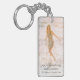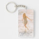 A modern, minimalist full photo funeral favour keepsake keychain to celebrate the life of your loved one in a minimalist clean simple design style featuring a elegant handwritten script font and a soft pastel peach background. The design template can easily be personalised with your own photo and text (poem or prayer) to create a special tribute for your loved one's funeral, memorial or celebration of life. The image shown is for illustration purposes only to be replaced with your own photo. The placeholder image shows a happy young woman with wavy long blonde hair wearing an elegant chic pastel floral summer dress standing in the sea at sunset on a sandy beach in the shallow breaking waves. #funeral #favour #keychain