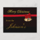 Beautiful Christmas greeting postcard with golden Merry Christmas text with green highlights on a black background. A faux red ribbon with golden bells and a red bow runs across the design. Very elegant Christmas design for your holiday items.