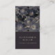 Elegant vertical business card features a midnight navy blue floral pattern with shades of smokey grey and accented hints of metallic gold. Custom name and title or role presented on a midnight blue banner with coordinating grey accents and text. The back of the card is plain and simple with coordinating text.