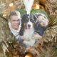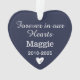 Simply elegant heart-shaped holiday memorial ornament can be personalised as a special remembrance keepsake for the loss of a pet dog, cat, or other loved one. Design features a photo on the front and custom 'Forever in our Hearts' with their name and lifespan on the back. Midnight blue colour and font styles can be modified.