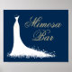 Wedding bridal shower mimosa bar display sign / poster for the stylish bride-to-be features a flowing wedding gown design, custom text that can be personalized. White, navy blue (can be customized), and champagne gold / tan colors.