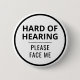 This special needs button features the slogan 'Hard of Hearing, please face me' in a bold black font on a white background. Also has a black circle border. You can edit the text as needed, and all the colours in the Zazzle design tool. ⭐ For more disability pins, visit my store: Zazzle.com/Elder_Vitality ⭐ For custom orders, message me on Zazzle