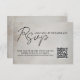 Enhance your wedding RSVP experience with our customisable elegant gothic minimal QR Code RSVP card. Featuring a distressed background and modern typography this card allows your guests to respond to your event effortlessly while also viewing your wedding website for more details. Be sure to view the design collection for all of your wedding stationary needs.