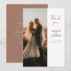 This elegant minimalist photo wedding thank you card features chic typography in black and trendy mocha coffee beige colours on a simple white background and one elongated vertical photograph. The ´´Thank you´´ header is in elegant calligraphy script and your names, divided by ampersand, are in a classic font. The reverse features a chic mocha colour background with your custom message in white. You can edit it or delete it for a more minimalistic look.