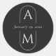 These minimalist monogram wedding 3" stickers feature the wedding couple's initials in white on a black background, bordered with an oval shape with the wedding date centred in between