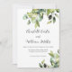 This elegant and minimalist wedding invitation features gorgeous watercolor eucalyptus, other greenery, botanicals and foliage in various tones and shades of green. Elegant script calligraphy for the couple’s names and simple, easy to read serif font for the wedding event details.