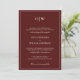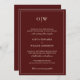 Burgundy wedding invitations with a modern monogram offer a bold and elegant choice for couples planning a formal and romantic celebration. This refined design features a deep wine red background accented by crisp white text and a delicate fine-line border, creating a striking yet timeless contrast. The centered monogram at the top adds a sophisticated personal touch, while the combination of classic serif and flowing script fonts enhances the overall elegance. Ideal for autumn and winter weddings, vineyard ceremonies, or upscale evening receptions, this invitation blends warmth and luxury in a visually impactful layout. With clearly structured text for names, date, venue, and reception details, it ensures clarity while setting an elevated tone for your event. Perfect for couples who want their wedding stationery to reflect both modern simplicity and traditional charm, this rich burgundy invitation sets the stage for a stylish, memorable celebration.