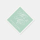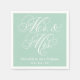 Wedding napkins feature "Mr. & Mrs." in a white calligraphy script font with custom monogram design that can be personalised with the bride and groom's married name and wedding date. Mint green and white colour scheme.