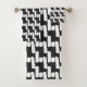 Elegant modern black and white bath towels featuring symmetric, abstract white stripes on the black background.