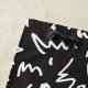 Elegant modern black and white beach towel featuring scattered, abstract white stripes on the black background.