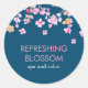 Chic elegant cherry blossom classic round sticker featuring pretty pink cherry blossom on a blue background with blush pink and white text for you to personalise with your own name(s) or messsage. Ideal for branding, packaging or as favour stickers for promotional purposes.