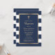 Elegant blue striped baptism invitation showcasing a gold cross, a frame and little stars.
