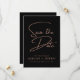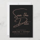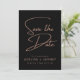 An elegant minimalist design is featured on this Save The Date Card. The black card has a Save The Date in a rose gold handwriting typography.