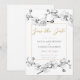 Branches of white orchids, hand-drawn in graphite pencil, intertwine in this simple but sophisticated, elegant yet chic wedding save the date. The hint of gold in the colour of the writing gives this a festive but subdued splash of colour.
