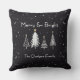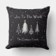 Elegant Modern Christmas Stars Pillow with Family Name designed with white Christmas trees with gold colored stars on a black background and white stars covering the pillow. The front text reads: Joy To The World, along with your Family Name. The reverse text reads: Merry & Bright with your Family Name. To personalize simply insert your name into our easy template, replacing the sample. Makes a great Christmas gift for someone special, or to decorate your home for the holidays. Note: Inserting your Family Name into the template with automatically repeat on the reverse.