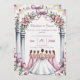 Wedding invitations decorated with pale pink flowers and light green leaves, featuring a bride and her bridesmaids.