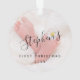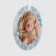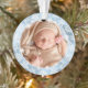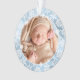 Modern personalized First Christmas ornament which features beautiful snowflake wreath, faux blue marble texture and elegant handwritten script lettering on the back side. Personalize the product with the name, the year and two of your favorite photos. This is a perfect gift for grandparents or great - grandparents.