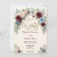 Announce your romantic garden ceremony with this sophisticated botanical suite, featuring a refined palette of dusty blue, blush pink, and burgundy roses.This design features a soft cream background framed by an arching border of dusty blue, burgundy red, and blush pink roses mixed with sage green eucalyptus foliage. The composition utilizes a formal typographical hierarchy, pairing elegant calligraphy script for names with a classic serif font for event details. A scannable square tech element is seamlessly incorporated into the traditional layout without disrupting the visual flow. This is a flat printed image with a printed watercolor painting effect, not actual raised material or hand-painted texture.