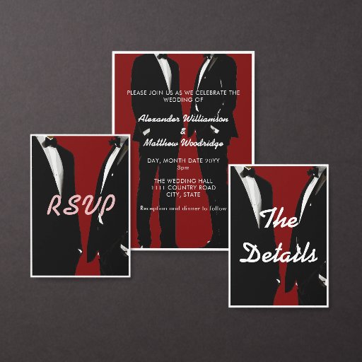 Simple, modern and elegant. Two men confidently sporting timeless tuxedos translate a narrative of love and everlasting commitment. The timeless and stylish black and white palette is elegantly complemented by a bold red background. This design can be seamlessly applied to wedding essentials such as save-the-dates, wedding invitations, wedding programs, thank you cards, reception menus, custom wedding decor. For customisation support, please email remidevandesigns@gmail.com RemideVan©