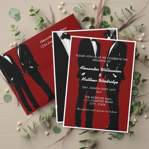 Simple, modern and elegant. Two men confidently sporting timeless tuxedos translate a narrative of love and everlasting commitment. The timeless and stylish black and white palette is elegantly complemented by an understated calligraphy and an elegant burgundy red background. This design can be seamlessly applied to wedding essentials such as save-the-dates, wedding invitations, wedding programs, thank you cards, reception menus, custom wedding decor. For customization support, please email remidevandesigns@gmail.com RemideVan©