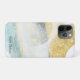 An elegant phone case with a gold, teal and gray watercolor effect abstract pattern. In the bottom left corner of the phone, in script dark gray typography, you can easily customize with your name.