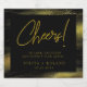 Modern elegant faux gold foil "Cheers!" lettering with golden glitter frame, personalised bottle label. Classic black colour background with golden text.