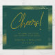 Modern elegant faux gold foil "Cheers!" lettering with golden glitter frame, personalised bottle label. Emerald green colour background with golden text.