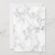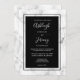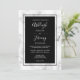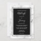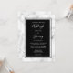 This simple yet elegant modern design features the bride and groom's first names in white script and the remaining text in white on a black rectangle framed by a white and grey marble pattern background.