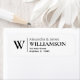 Chic modern return address label featuring a prominent monogram and emphasised last name in a stylish serif font. Address details in a minimal compressed font, ensuring clear readability while being presented in an understated way. Suitable for personal and small business use. Fully personalizable. Contact for assistance in personalising or help in customising to meet your need.