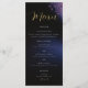 A few branches of eucalyptus leaves, hand-drawn in colour pencil and layered with shades of dusty and dark purple, make for a modern, sophisticated, elegant yet chic wedding menu card. The black and dark blue background with hints of purple and lights illuminate the midnight sky. The elegant calligraphy script, in the hue of gold, makes this stylish black and purple design even more festive and elegant.