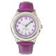 Designed for the kid who is learning to read the time, the face of the watch has clear readable dial, and fun cool stylish snazzy colour. The hour and every 5 minutes are clearly written while the 5-minute-in-between are indicated by a short line to help the kid learn to read the time with ease. Custom, personalised, kids girls cool stylish elegant modern trendy purple leather strap, stainless steel case, wrist watch. Simply type in the name. Go ahead create a wonderful, custom watch for the lil girl in your life; daughter, sister, niece, granddaughter, goddaughter, stepdaughter. Makes a great custom personalise gift for birthday, graduation, christmas, holidays, and more.