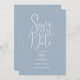 This dusty blue elegant script wedding save-the-date invitation can be personalised with all your special wedding day information and wedding website QR code. Designed by Thisisnotme©