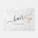 Modern and elegant design for hairstylists with faux rose gold scissors, elegant calligraphy font and white marble background.