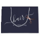 Modern and elegant design for hairstylists with faux rose gold scissors, elegant calligraphy font and blue background.