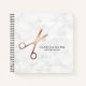 Modern and elegant design for hairstylists with faux rose gold scissors, elegant calligraphy font and white marble background.