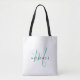 Elegant Modern White Teal Script Monogram Tote Bag. An elegant teal script monogram combined with a clean black san-serif font makes for a contemporary look.