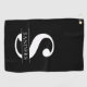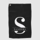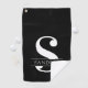 An elegant golf towel featuring a bold white monogram across a black background. Atop of this monogram sites your last name.