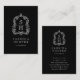 This elegant vertical business card design features an ornate vintage crest in white on a black background, framing a pair of monogram initials in open serif font. Add your name, title and (on the reverse side) contact information in white on black.
