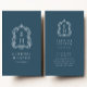 This elegant vertical business card design features an ornate vintage crest in white on an indigo background, framing a pair of monogram initials in open serif font. Add your name, title and (on the reverse side) contact information in white on indigo.