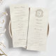 This elegant ivory and taupe wedding program features an ornate crest at the top with the monogram initials of the bride and groom in fancy formal script font.