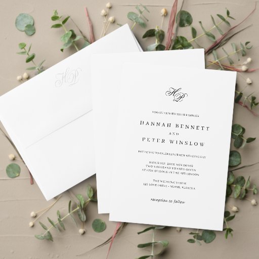 This timeless black-and-white wedding invitation exudes elegance and sophistication. At its centerpiece, a beautiful monogram features the couple's initials in a light grey Flemish script font. The monochromatic palette enhances the invitation's minimalist charm, allowing the intricate details of the script to take centre stage, evoking a sense of understated luxury. Perfect for couples who value modern sophistication with a touch of classic romance, this invitation sets the tone for an unforgettable celebration.