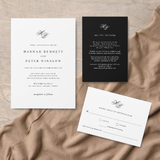 This timeless black-and-white photo wedding invitation exudes elegance and sophistication. At its centerpiece, a beautiful monogram features the couple's initials in a white Flemish script font. The monochromatic palette enhances the invitation's minimalist charm, allowing the intricate details of the script to take centre stage, evoking a sense of understated luxury. Perfect for couples who value modern sophistication with a touch of classic romance, this invitation sets the tone for an unforgettable celebration.